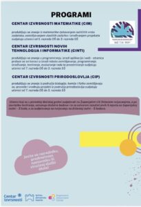 U sklopu programa Centra izvrsnosti Splitsko-dalmatinske županije, učiteljice naše škole Marijana Gudić i Marijana Bandić Buljan održale su niz zanimljivih i edukativnih radionica iz područja prirodoslovlja u tijeku ove nastavne godine. Radionice su bile namijenjene učenicima sedmih i osmih razreda, a kroz raznolike teme učenici su imali priliku proširiti svoja znanja i razvijati istraživačke vještine. Programi Centra izvrsnosti se održavaju kroz dvanaest radionica od listopada do travnja. Ove nastavne godine novost je i dva izleta koja su organizirana te su polaznici imali priliku posjetiti Botanički vrt Split te Izvor Jadra.
