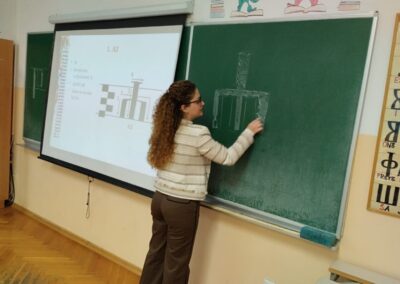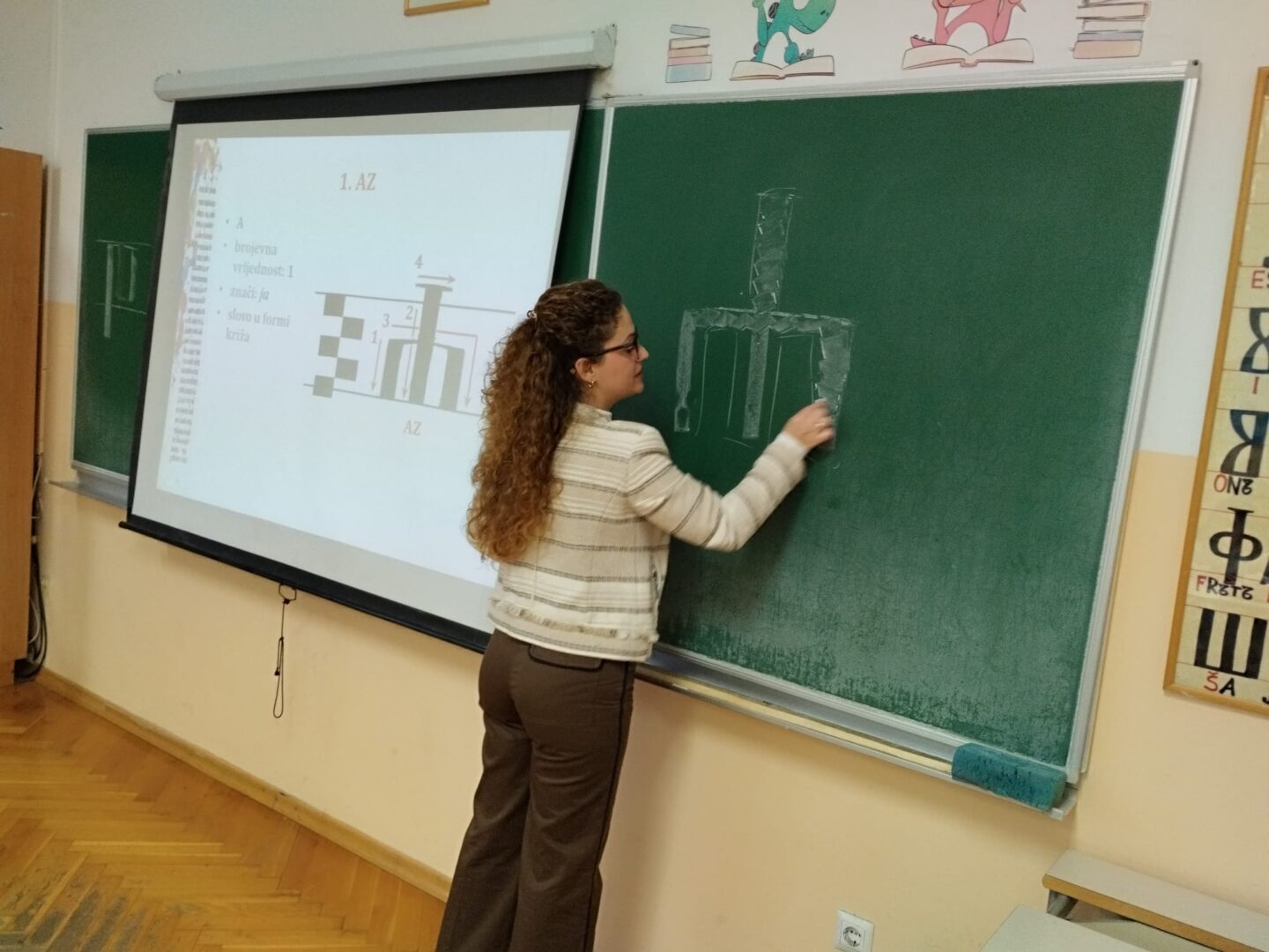 Radionicu je provela učiteljica hrvatskoga jezika Jelena Karaman. Cilj radionice bio je upoznati učenike s glagoljicom kao najstarijim hrvatskim pismom i važnim dijelom hrvatske kulturne baštine. Kroz prezentaciju i razgovor učenici su saznali da su Hrvati u svojoj povijesti koristili tri pisma – glagoljicu, hrvatsku ćirilicu i latinicu – te da je glagoljicu u 9. stoljeću stvorio sveti Ćiril uz pomoć svoga brata Metoda. Poseban naglasak stavljen je na činjenicu da su Hrvati više od tisuću godina koristili glagoljicu i da su imali posebno papinsko dopuštenje za uporabu vlastitog jezika i pisma u crkvenom bogoslužju. Učenici su se upoznali i s različitim vrstama glagoljice, osobito s uglatom (hrvatskom) glagoljicom, te s Bašćanskom pločom kao najstarijim i najvažnijim glagoljičkim spomenikom. Učenici su imali priliku čuti i zvučni zapis teksta Baščanske ploče kako bi usporediti hrvatski jezik 11. i 21. stoljeća.